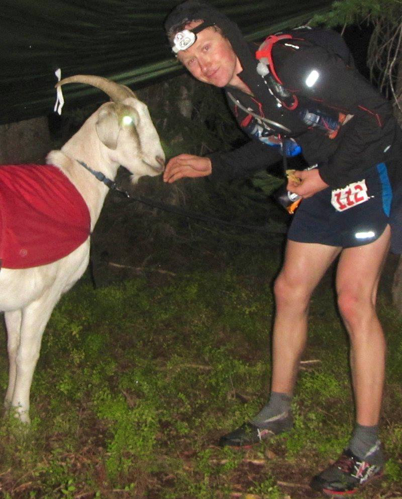 We hit a river crossing with a camping party on the other side. How the hell do we get across? I picked my way over the rocks, and realized that it was the goat aid station, mile 74.4… and, *holy shit, *Kyle Ormsby, the third place runner, was just leaving.