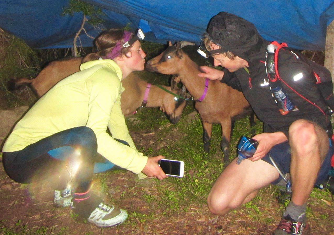 Jenna had been looking forward to the goat aid station for months. I had too, but we had to go! The couple running the aid station was so sweet, welcoming us in with fresh food and asking us to pose for pictures with the goats.