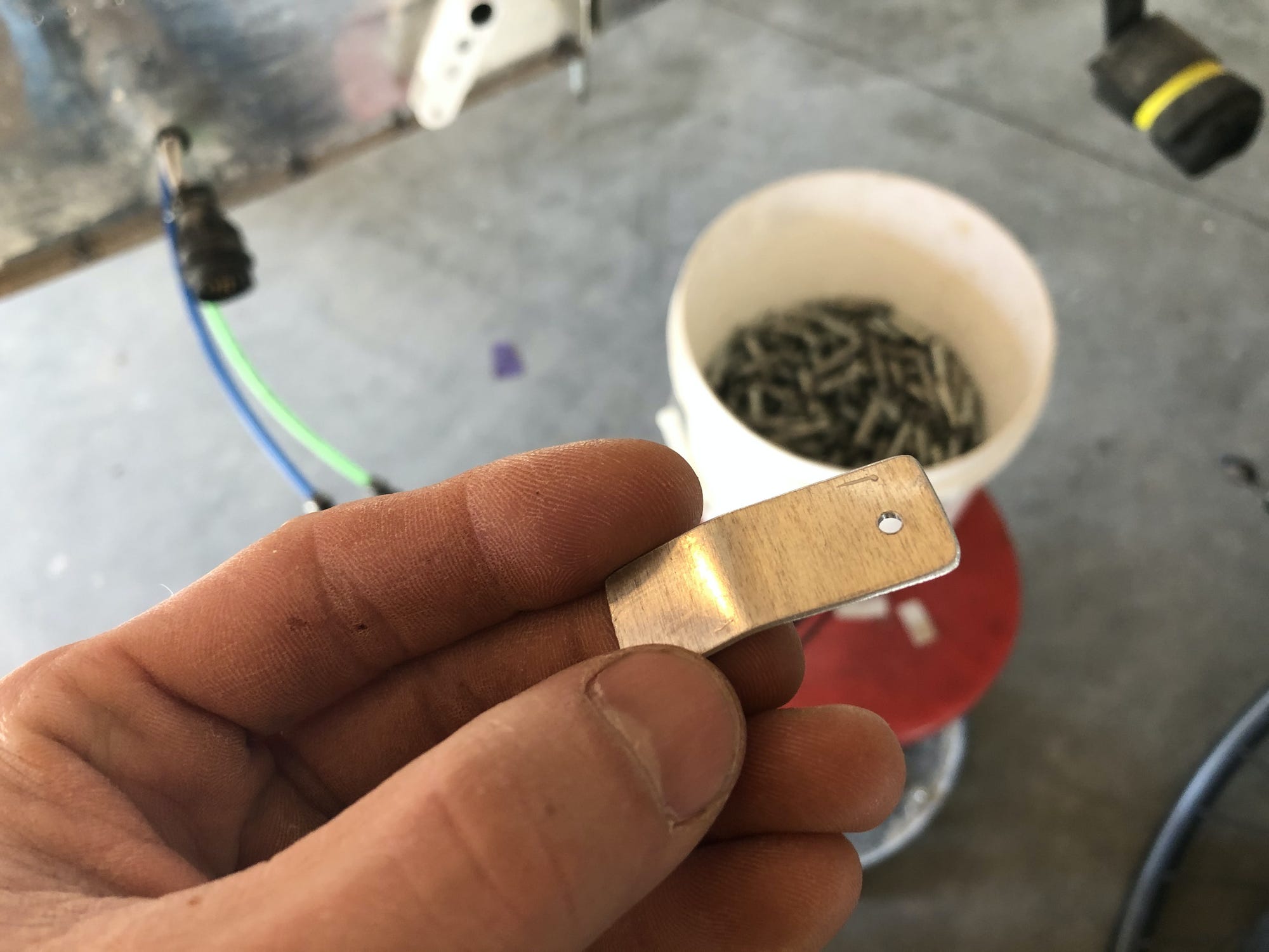 I used my shears to cut a long strip of .050" aluminum off the edge of a large sheet of scrap, snipped off a piece about 1.5" long and used that as a template to cut successive pieces off of the strip. I took the pile to my grinder and knocked the sharp burrs off of the cut edges with the scotchbrite wheel, rotating and flipping each metal rectangle by hand. Next, to the drill press to put a #40 hole off to the side of each clip, then over to the bench vice to bend each rectangular tab somewhere in the middle. I didn’t measure anything, as the exact dimensions here don’t matter. I do a lot more eyeballing now, so many years into this project.