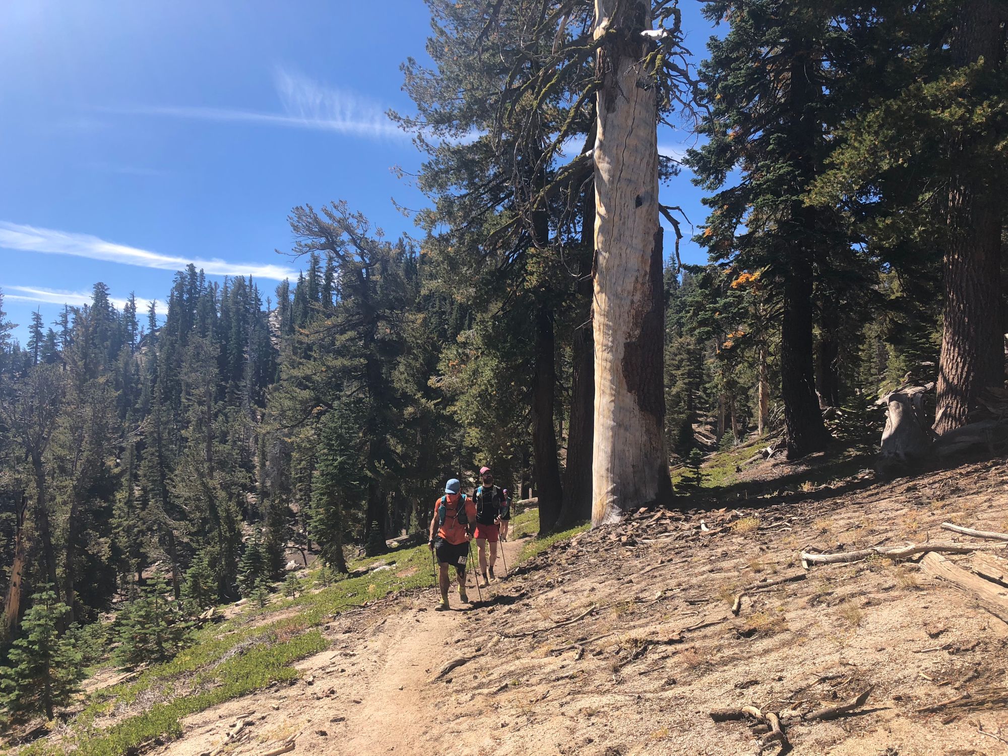The trail narrowed and took us out past scrubby trees. We passed a man with, of all things, a baby chariot, taking his kid for a walk in the deep backcountry. He’d pushed the chariot out over the edge of the trail, teetering, to give us space to pass.We reached a huge peak, the high point, maybe 1,500’ up. I was honestly excited to climb to give my legs a break from the hours of Tahoe Downhill… but the trail skirted around the mountain! A Reverse False Summit, the climb plucked away at the last minute.
