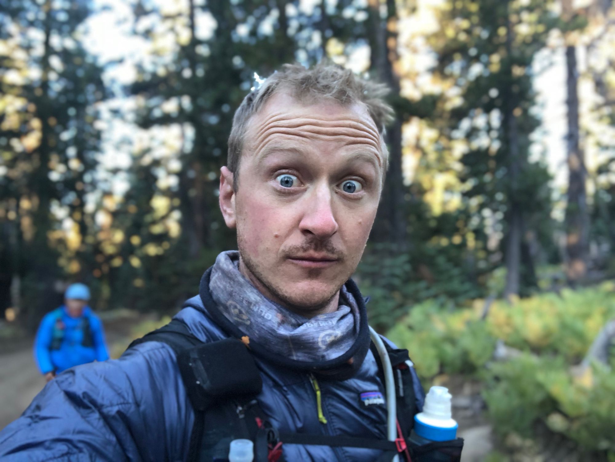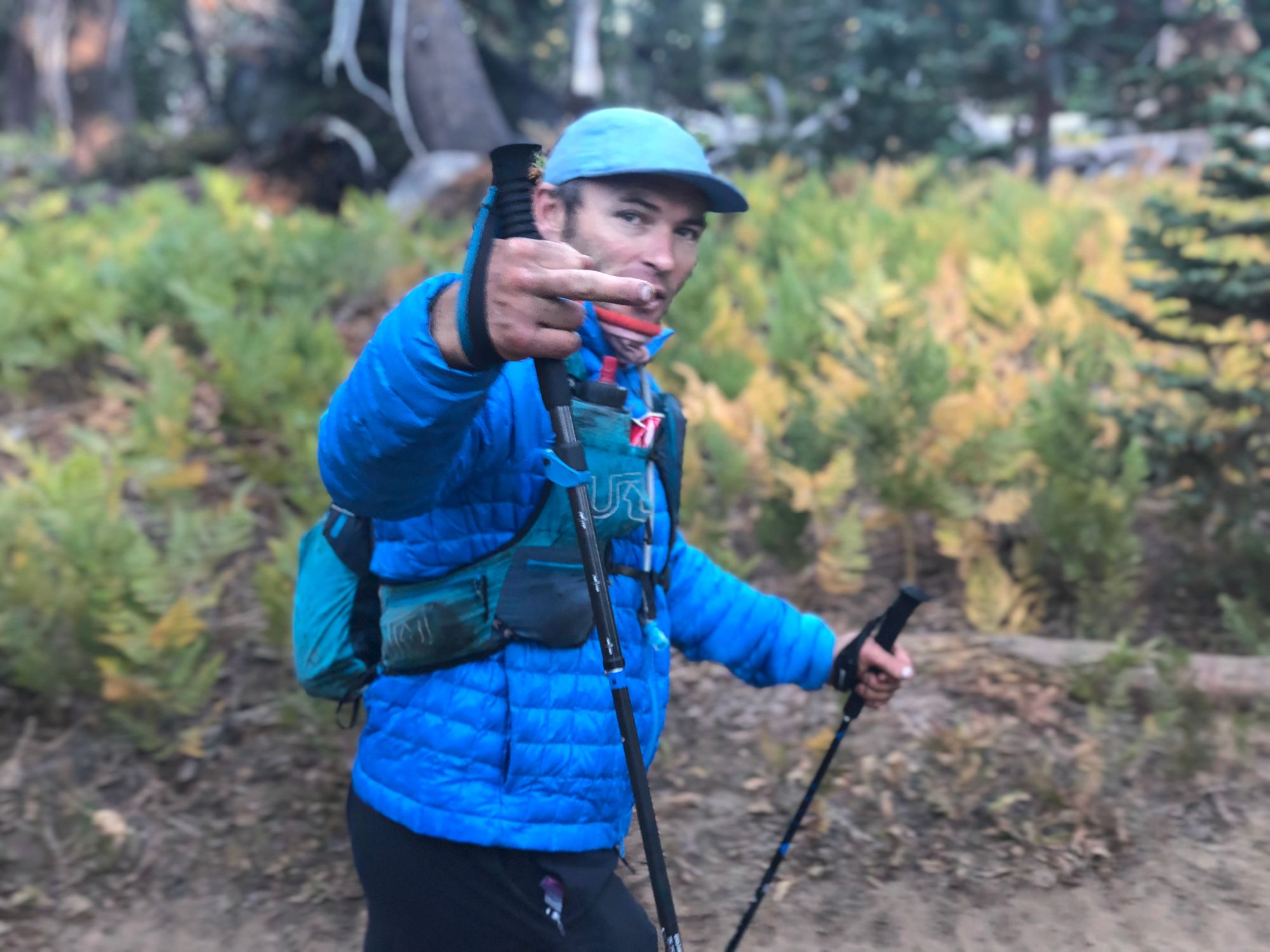 Jason caught me as we crossed the highway - we were far from the lake, now, and the next stretch looked like miles of pine-needled rollers at a fairly steady elevation. It was time to bank some more miles. We popped another piece of caffeinated gum each, clacked poles and started striding with purpose up the trail.I was leading and, just ahead, my headlamp glinted off an ocean of white spandex studded with reflective strips. Could it be? It was Kilian, from the fields of dinosaur eggs on day 2! Kilian’s real name was Serge Chapuis. We would later learn that Serge is an absolute legend. Serge was the head of Salomon’s R&D lab and responsible for the gear that the actual Kilian had worn for years. He’d designed the pack I was wearing. Serge’s entire kit was custom, designed by him, for him, for the Tahoe 200.