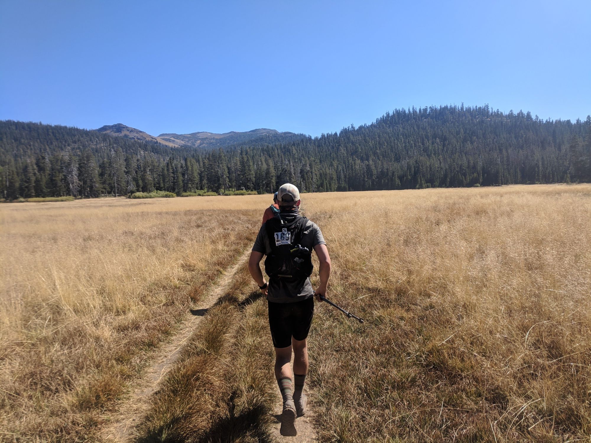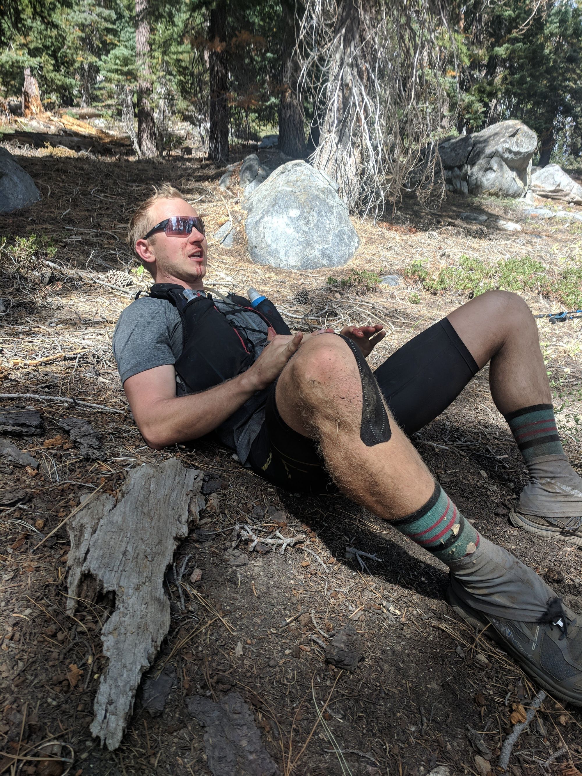 I felt okay again, and J was starting to look tired. Balance was restored to the universe. We turned left off of the road down a hill dense with itchy grass, then onto a trail through a grove of large trees. 1.5 miles out of the aid station we decided to take another 10 minute trail nap on the side of the trail with our feet up on a big log. I fell asleep, then woke to see two runners walking by, staying quiet, looking toward us with understanding. This was one of the most wild parts of Tahoe - the itinerant homeless community of trail-napping athletes.