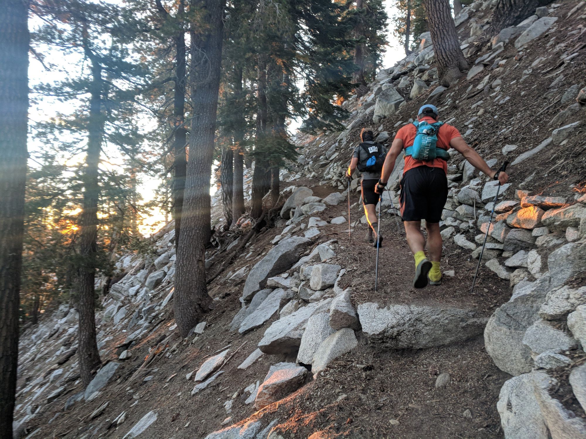 Rosy-fingered Dawn tickled the clouds and light seeped into the day. The trail was built out of boulders arranged on the side of the steep hill. I was happy that Aaron had joined us for such a beautiful section devoid of dust. Aaron has wanted to run Tahoe for a couple of years. What a way to preview the course.