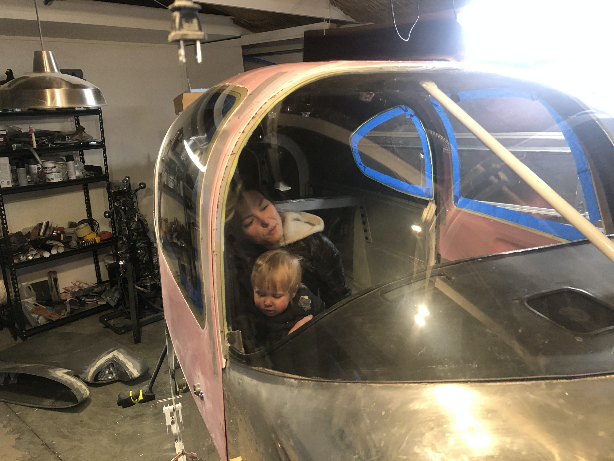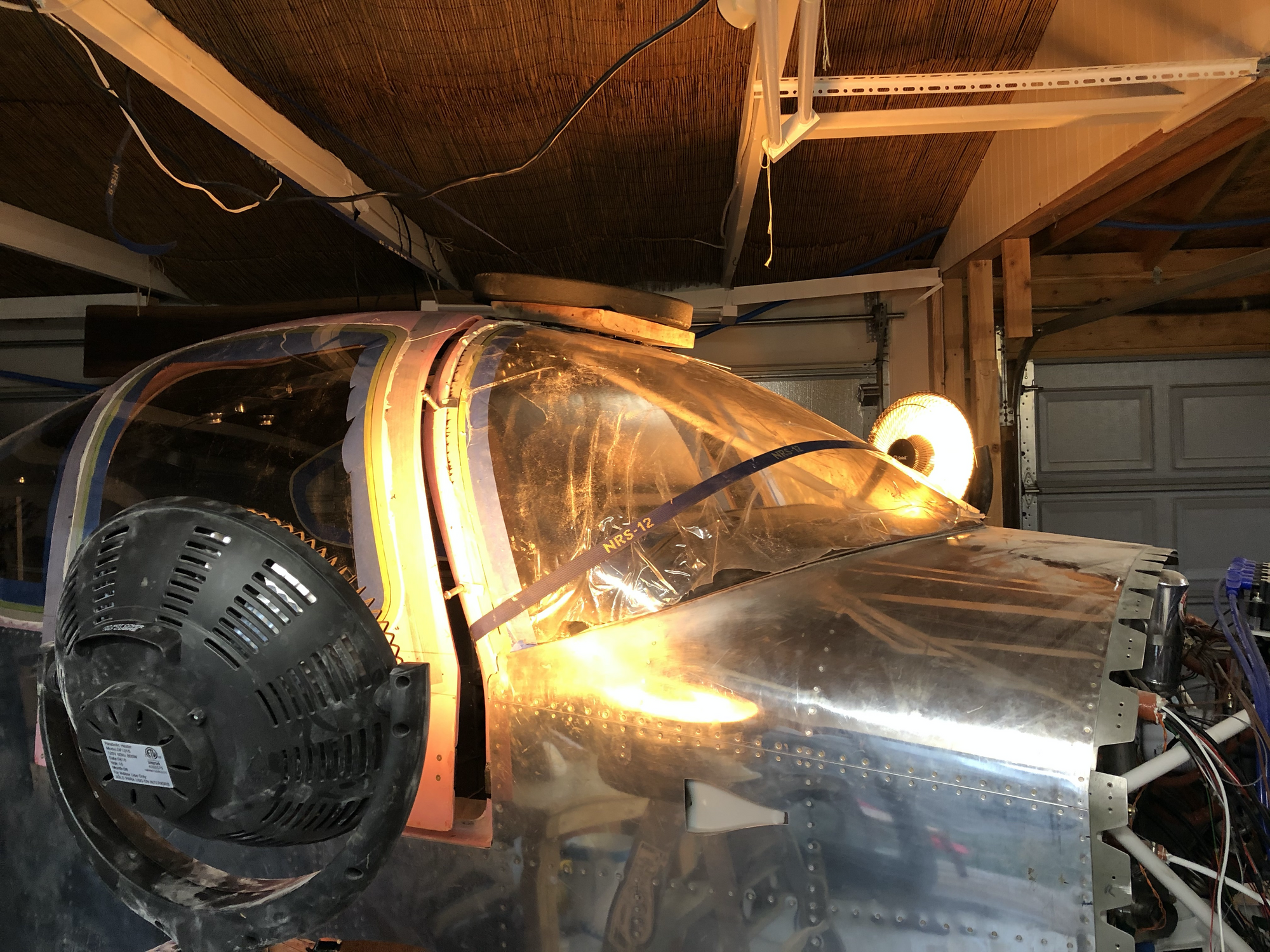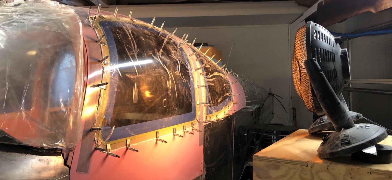 Here’s a shot of the two windows on the left side of the plane curing with my heat lamp. I disabled the safety switch on the bottom of the lamp with tape and tilted it up precariously so it could point at the right angle. Not recommended!